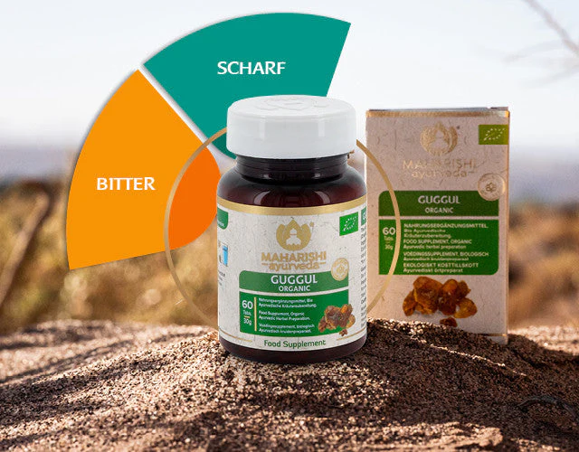 Guggul is de waardevolle gomhars van de Indiase mirreboom (Commiphora Mukul). Van oudsher wordt guggulsap gewonnen uit de stam van de balsem- of mirreboom. De Indiase naam guggulu betekent ´dat wat beschermt tegen ziekten´. Binnen ayurveda geldt de hars met zijn bittere, scherpe, zoete en wrange smaak als rasayana en heeft een regulerende werking op de drie dosha’s. Guggul wordt met name aanbevolen wanneer Vata of Kapha uit balans zijn.